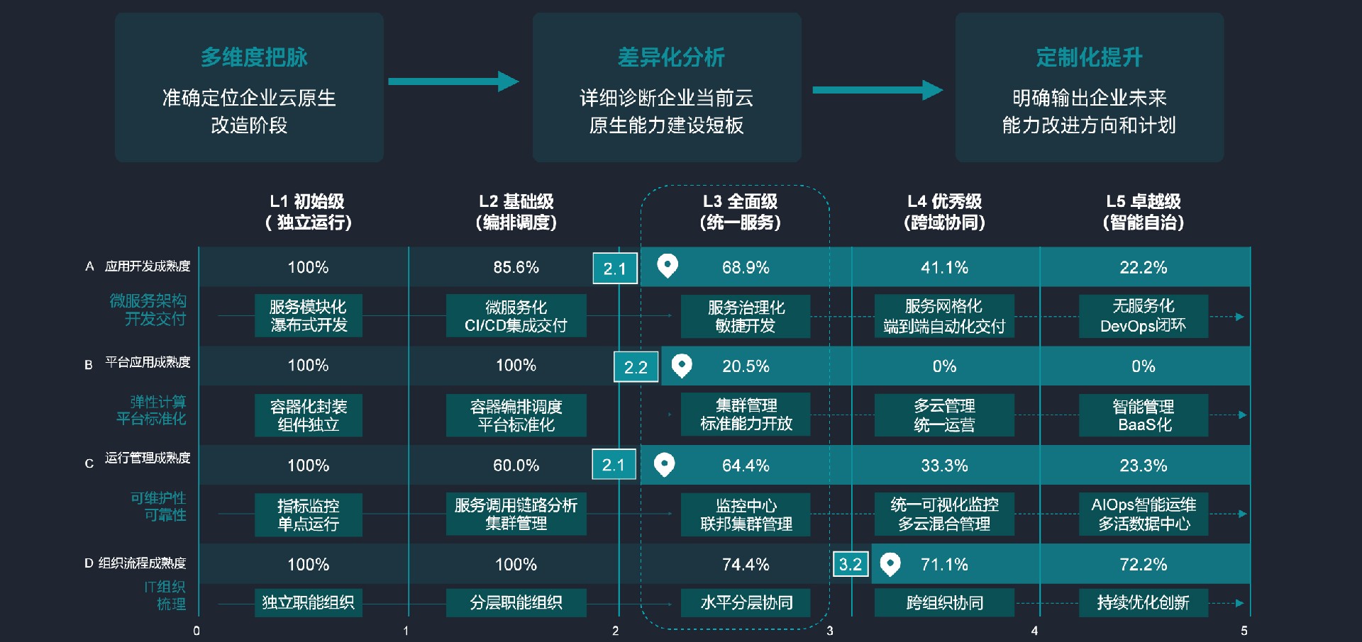 模型根据电信行业IT业务系统的特点进行定制化评估体系设计,为客户量身打造适合自身业务的云原生能力评估和管理方案。